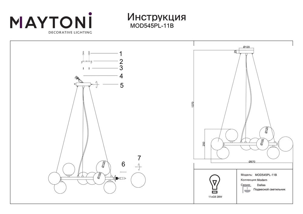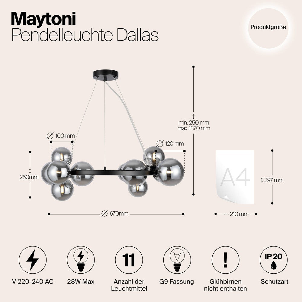 Illuminate your space with the Dallas Circular Pendant Lights With Smoky Shades, a striking centrepiece that marries form and function. This modern industrial chandelier features 11 smoky glass spheres arranged in a molecular structure, creating a captivating interplay of light and shadow. Perfect for your living room, bedroom, kitchen, or office, its black metal frame and 67 cm diameter make a bold statement. Customise your ambiance by choosing your preferred G9 bulbs (up to 28W each, not included). With an adjustable height up to 137 cm, it adapts effortlessly to your space. Backed by a 2-year warranty and responsive customer service, this Maytoni masterpiece promises to elevate your interior design with its unique blend of industrial chic and contemporary elegance.