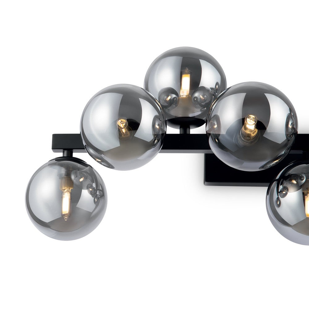 Bring a touch of molecular magic to your space with the Dallas Short Wave Wall Lamp In Black. This modern industrial stunner features nine smoky glass spheres perched on a sleek black metal frame, creating a sculptural centrepiece that's equal parts art and illumination. Whether gracing your living room, bedroom, or even a swanky restaurant, this versatile lamp adds drama wherever it goes. At 60.5cm wide, it makes a statement without overwhelming. Choose your own G9 bulbs (up to 28W each) to customise the ambiance to your liking. Part of a larger collection, this lamp lets you create a cohesive look throughout your space. With a two-year warranty and responsive customer service, you can light up your life worry-free.